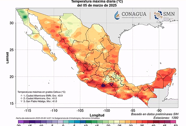 En una imagen del 2 de marzo pasado se comenzaban a ver por arriba de 40 grados en algunos sitios del país, pero al menos en el centro del territorio nacional no se están rebasando las normales climatológicas (o promedios de temperatura máxima), aclaró el experto.